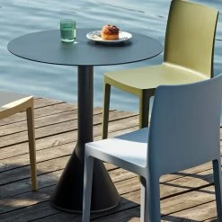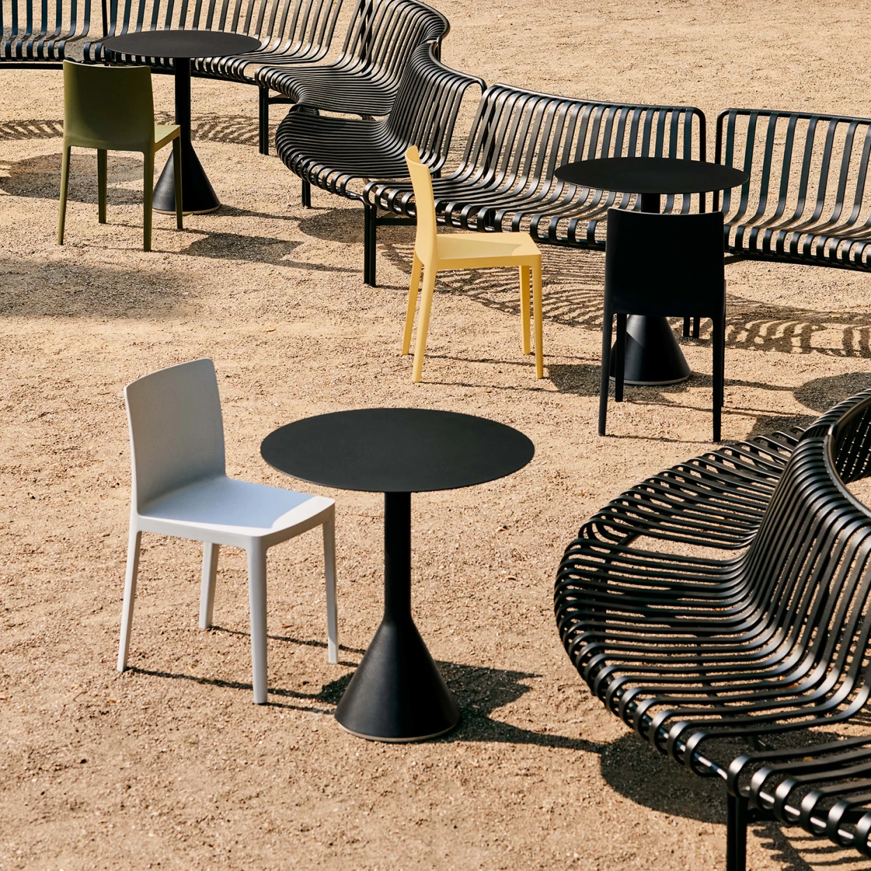 Eine ultradünne Tischplatte aus Stahl und eine solide Basis aus kegelförmigem Beton bilden die Basis für diesen Tisch von HAY.