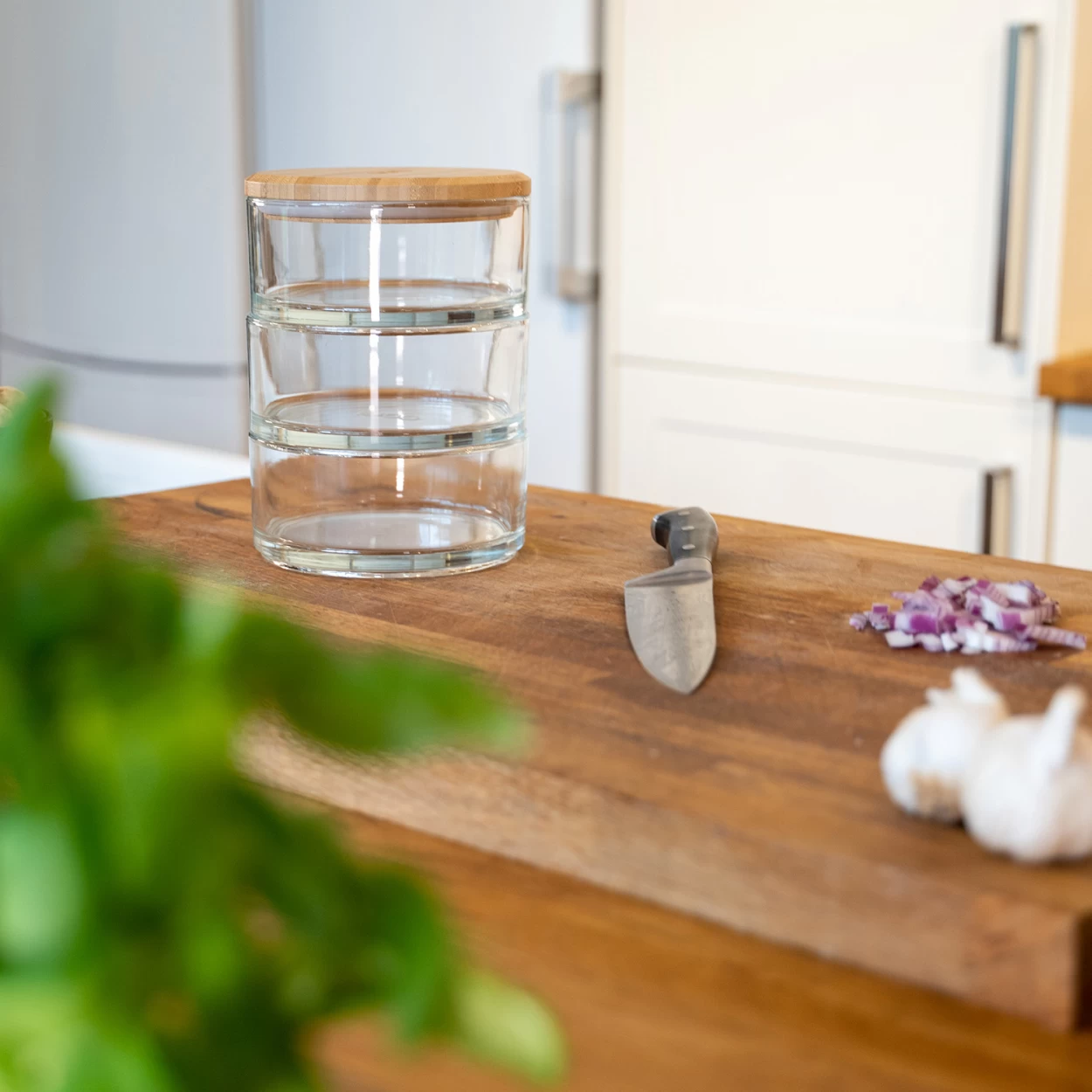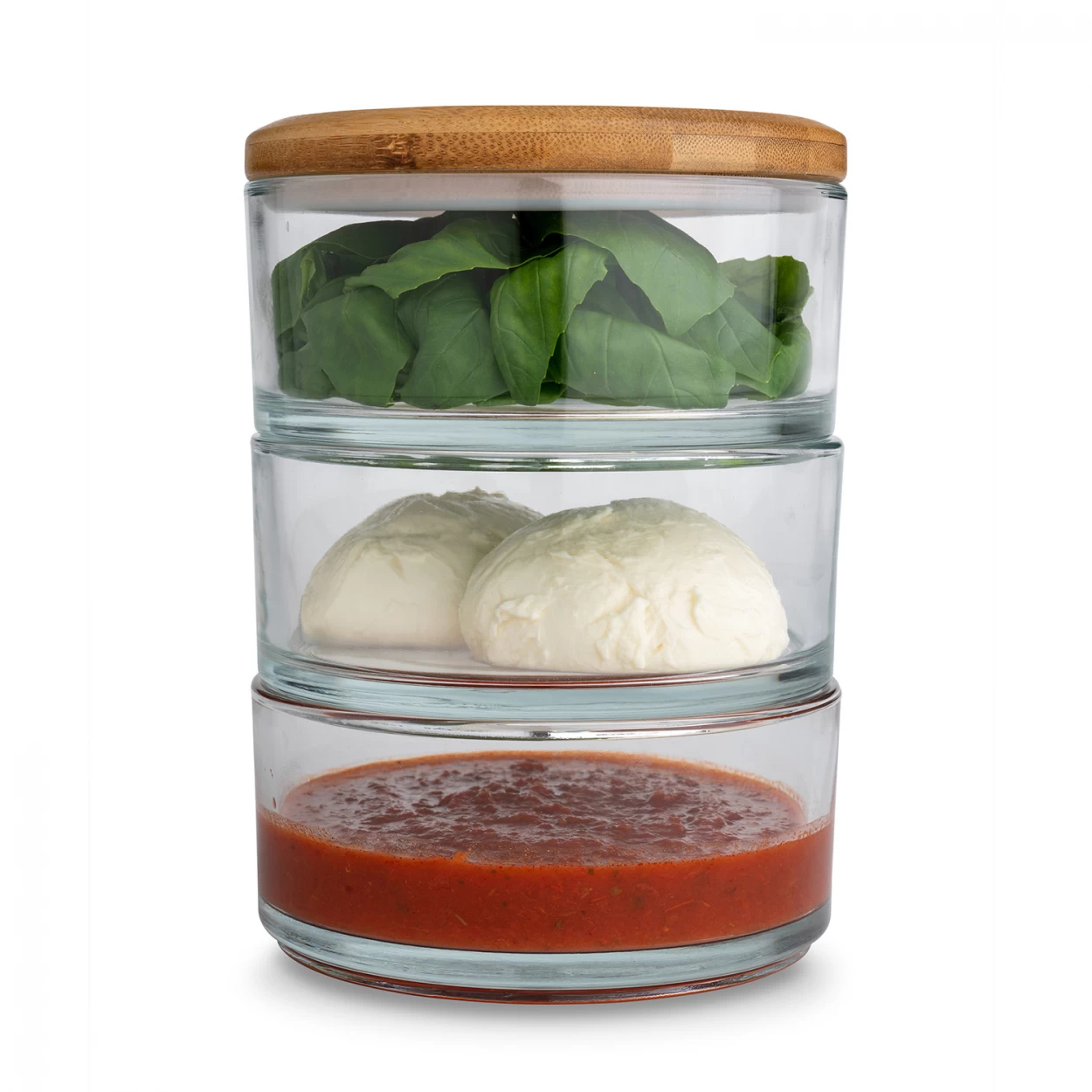 - 3 Glasschalen mit Bambusdeckel und abnehmbaren Abdichtungen.