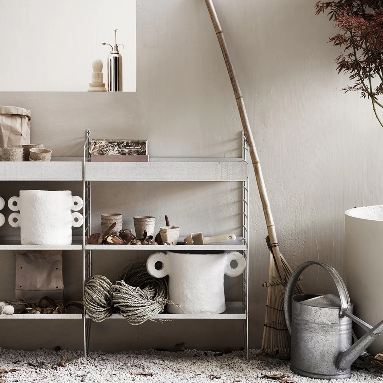 Das populäre Regalsystem von String gibt es nun auch für Draußen. Um jeder Witterung standzuhalten, bestehen bei der Outdoor-Variante die Regalböden aus Aluzink, einem mit Aluminium-Zink beschichteten Stahl. Der hohe Rand des hier zu sehenden Regalfachs verhindert das Herunterrollen der abgelegten Gegenstände. Alternativ ist das Metallfach auch mit niedrigem Rand erhältlich. Alle Regalböden sind durchgängig mit einer Perforation versehen, wodurch Wasser problemlos ablaufen kann. Das robuste Regal passt ideal in die Garage oder in den Garten. Dort bietet es Platz für Deine Ski-Ausrüstung, Werkzeuge oder die Auto-Politur und ermöglicht eine elegante und funktionelle Lagerung im Freien.
