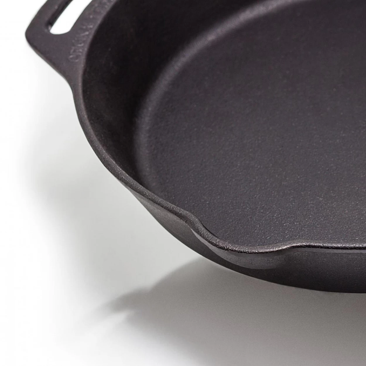 und nach der Benutzung sogar aufgehängt werden kann. Außerdem sind am oberen Rand der Pfanne zwei Wölbungen angebracht, um Bratensaft oder Soße leicht ausgießen zu können.