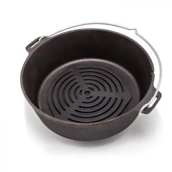 Mit dem Gussrost Einsatz können Sie innerhalb des Feuertopfes dank der sehr guten Hitzeverteilung dünsten, garen und backen. Der Einsatz steht auf drei kleinen Füßen, sodass das Gericht keinen direkten Kontakt mit dem Boden hat und schonend zubereitet werden kann.
