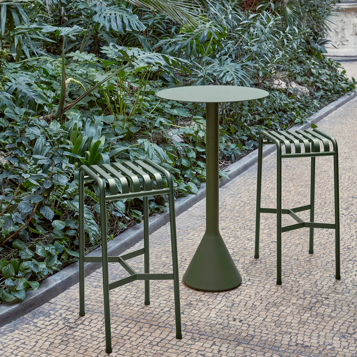 Mit seinen beruhigenden Farben wahlweise in Grün oder Grau ist der Outdoortisch ideal für Terrassen, Balkone, Gärten, Cafés und öffentliche Räume geeignet.