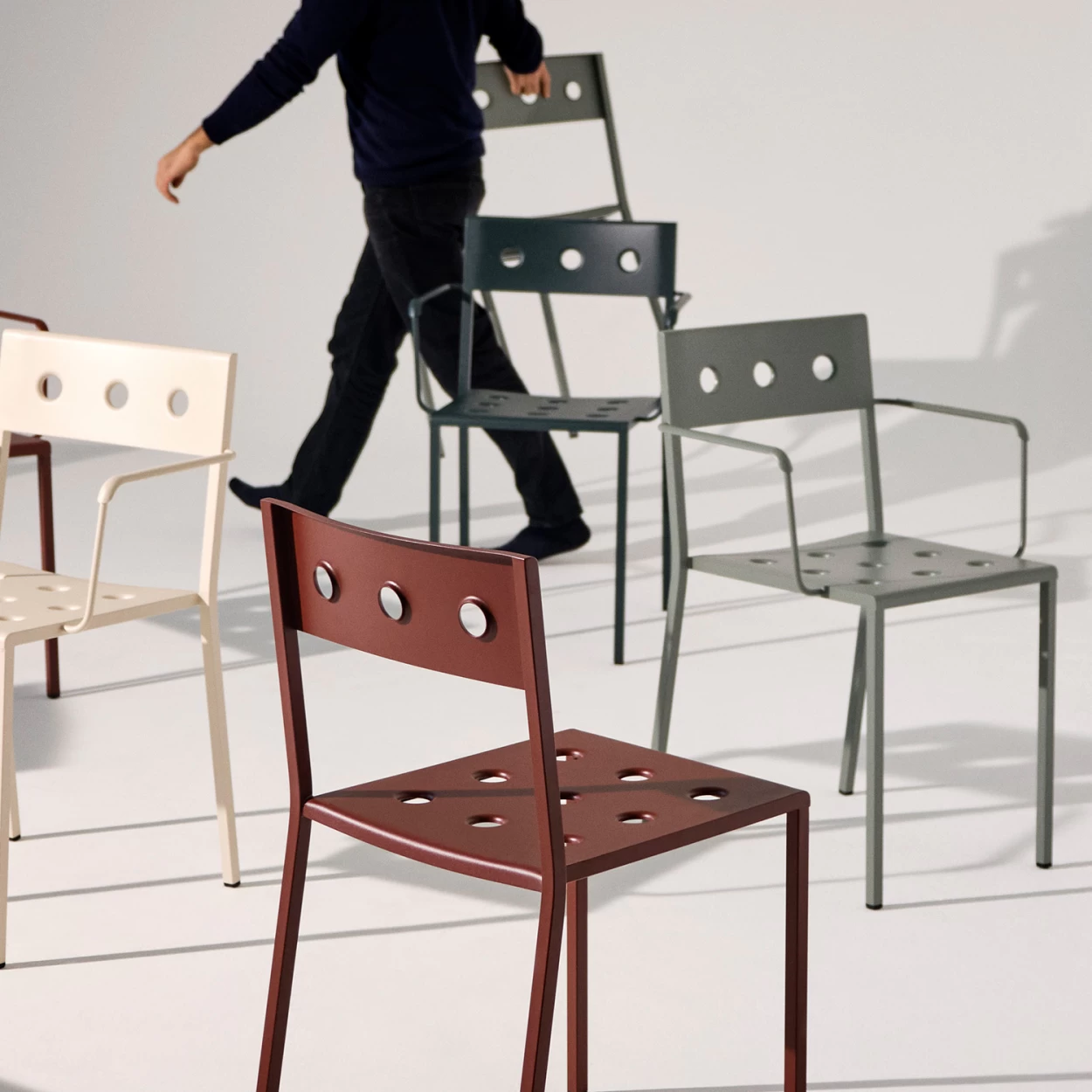 Der Balcony Chair ist ein eleganter und funktionaler Esszimmerstuhl für den Außenbereich. Ronan und Erwan Bouroullec haben ihn für HAY in einem quadratischen Design entworfen, das durch die abgerundete Rückenlehne aufgelockert wird. Die Löcher in Sitz und Rückenlehne verstärken die Konstruktion, lassen Regenwasser leichter ablaufen und verleihen dem Stuhl einen besonderen Ausdruck. Balcony besteht aus pulverbeschichtetem Stahl mit einer Grundierung für den Außenbereich, was ihm eine optimale Widerstandsfähigkeit und Haltbarkeit schenkt. Er ist in verschiedenen stilvollen Farbvarianten erhältlich. Da er außerdem stapelbar ist, eignet sich der Stuhl nicht nur für größere Außenbereiche und Gärten, sondern auch für kleine Balkone und Terrassen. Ein robuster Hingucker für Deinen gemütlichen Outdoor-Bereich.