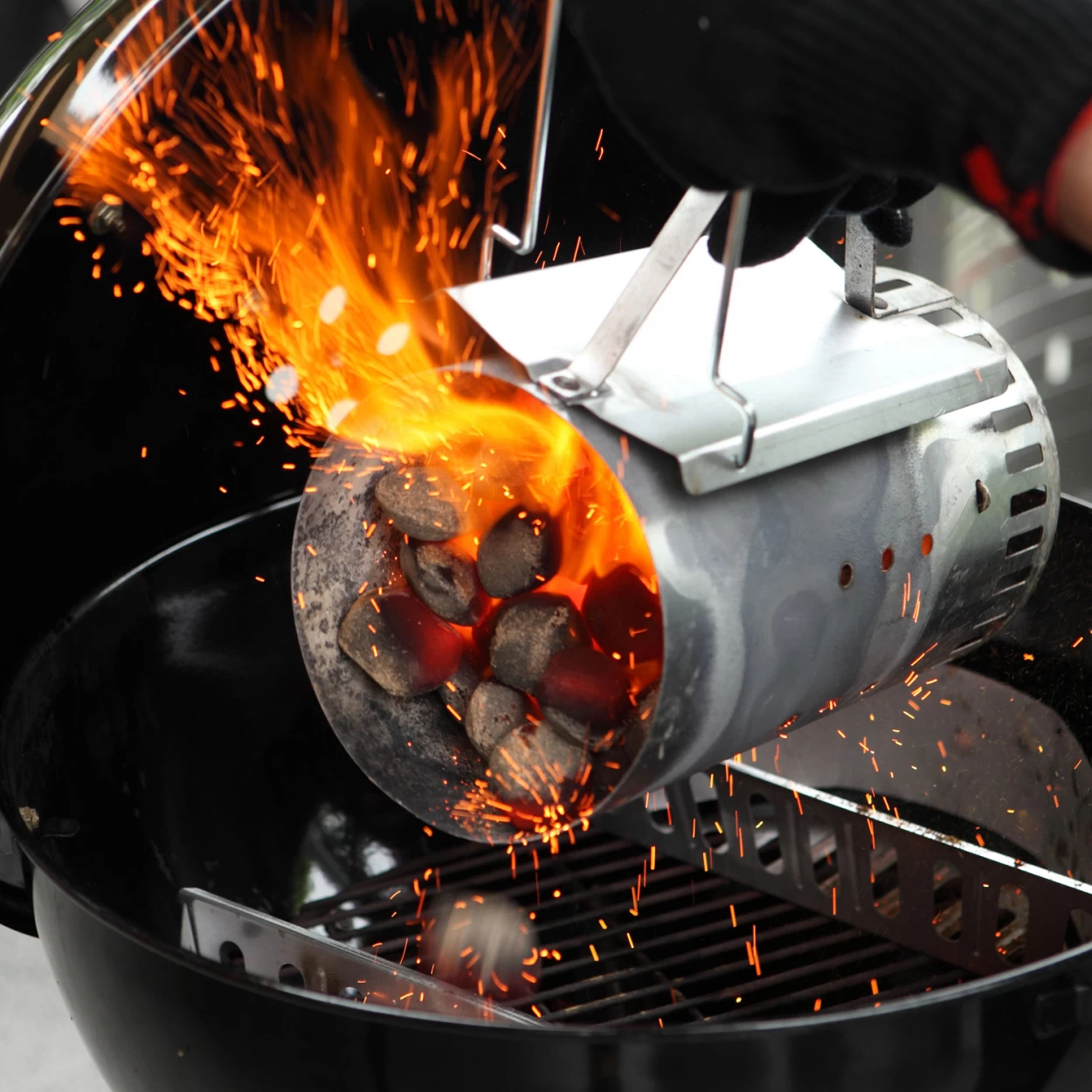 Bringen Sie Weber® Anzündwürfel oder zerknülltes Zeitungspapier unter den mit Briketts gefüllten Kamin und zünden Sie die Würfel bzw. das Papier an. Durch die kaminähnliche Konstruktion leitet der Luftzug die Flammen direkt auf die Holzkohle, die sich dadurch deutlich schneller entzündet. Auf diese Weise erhalten Sie rasch eine schöne Glut, die nun problemlos zum direkten oder indirekten Grillen auf den Holzkohlerost gekippt werden kann!