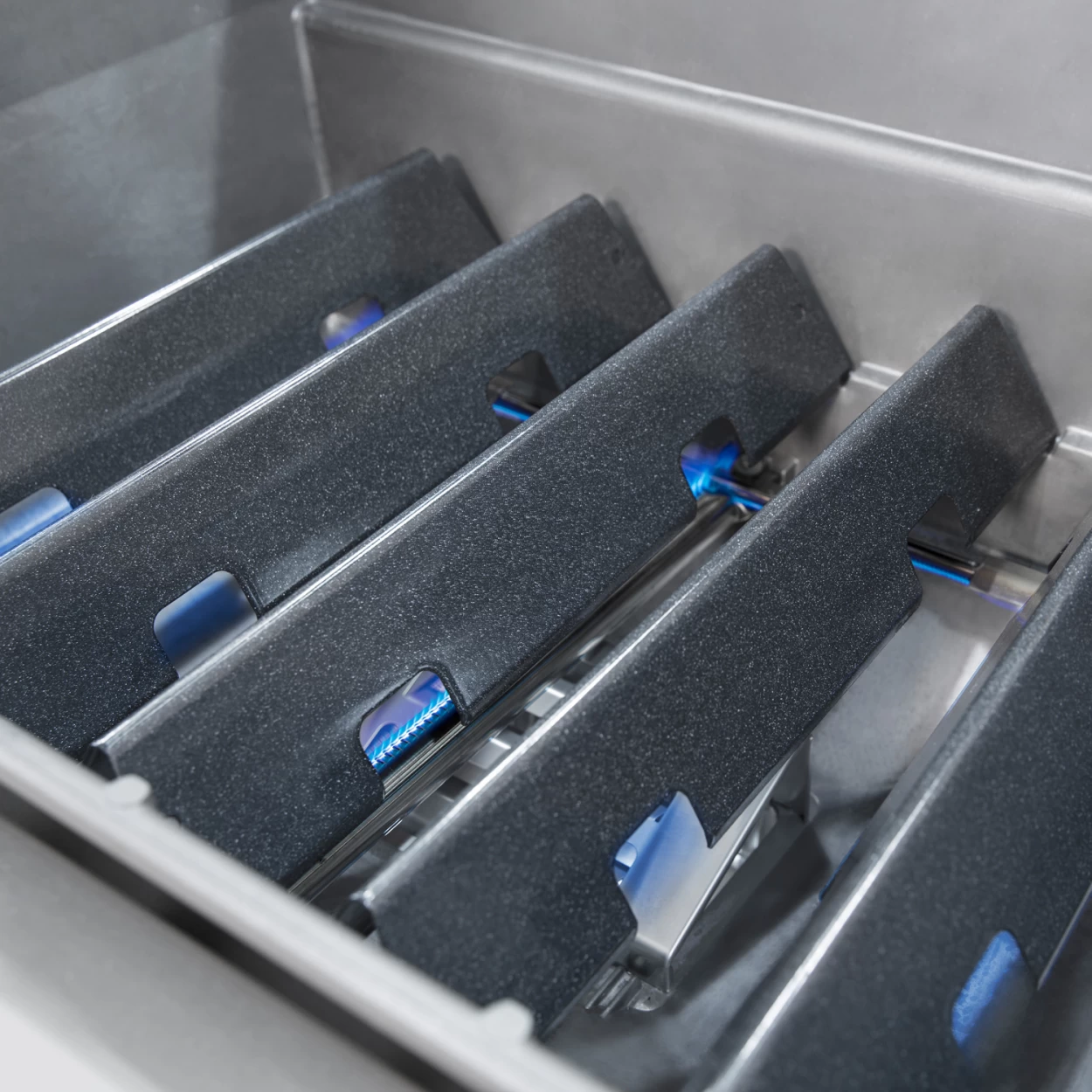 Die 3 Edelstahlbrenner mit einer Gesamtleistung von 9,4 kW sind Ă€uĂerst strapazierfĂ€hig und resistent gegen Korrosion. Sie werden durch emaillierte Aromaschienen geschĂŒtzt, die das Herabtropfen von Fleischsaft oder Marinade verhindern. Diese Schienen, wie der Name schon vermuten lĂ€sst, verleihen dem Grillgut ein zusĂ€tzliches Aroma, wenn der Fleischsaft auf ihnen verdampft. Die drei Brenner lassen sich stufenlos ĂŒber die vorderen Regler einstellen und können sicher und schnell per Piezo-ZĂŒndung gestartet werden. Ihre unabhĂ€ngige Regelbarkeit ermöglicht sowohl direktes als auch indirektes Grillen. Mit dem integrierten Deckelthermometer behalten Sie stets die Innentemperatur des Grills im Blick, um Ihr Grillgut optimal zu garen.