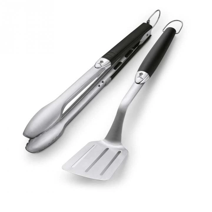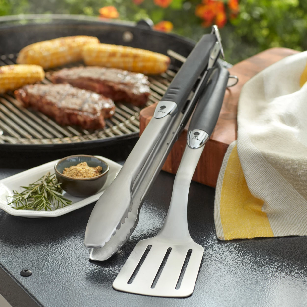 Das Besteck-Set aus Edelstahl mit Kunststoffgriffen ist optimal fĂŒr das Wenden des Grillguts geeignet.