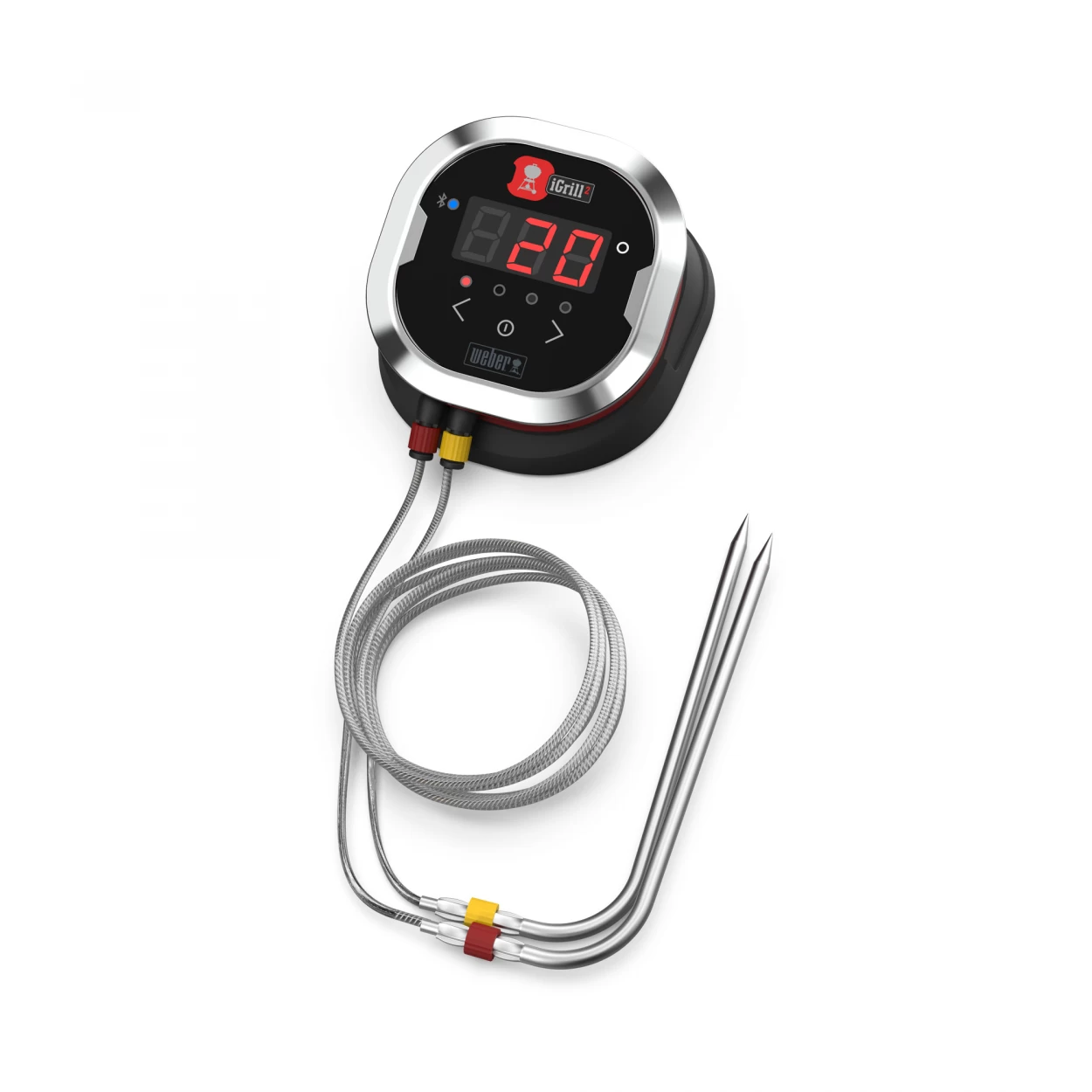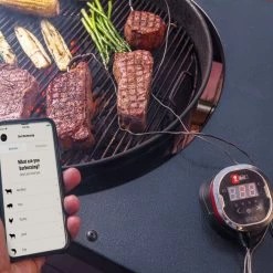 Dieses vielseitige Thermometer verbindet sich via Bluetooth mit der kostenlosen Weber iGrill-App und misst sowohl die Kern- als auch die Temperatur in der Grillkammer. Man hat die freie Wahl – voreingestellte Werte nutzen oder eigene Werte festlegen. Das Thermometer enthält 2 Messfühler und ist für bis zu vier Fühler geeignet. Das Display auf dem Thermometer zeigt die aktuelle Temperatur des ausgewählten Fühlers an, sodass man den Garpunkt auf einen Blick kontrollieren kann. Die kostenlose Weber iGrill-App liefert umfangreiche Informationen zum Garprozess und hält vielseitige Funktionen und Einstellungsmöglichkeiten bereit.