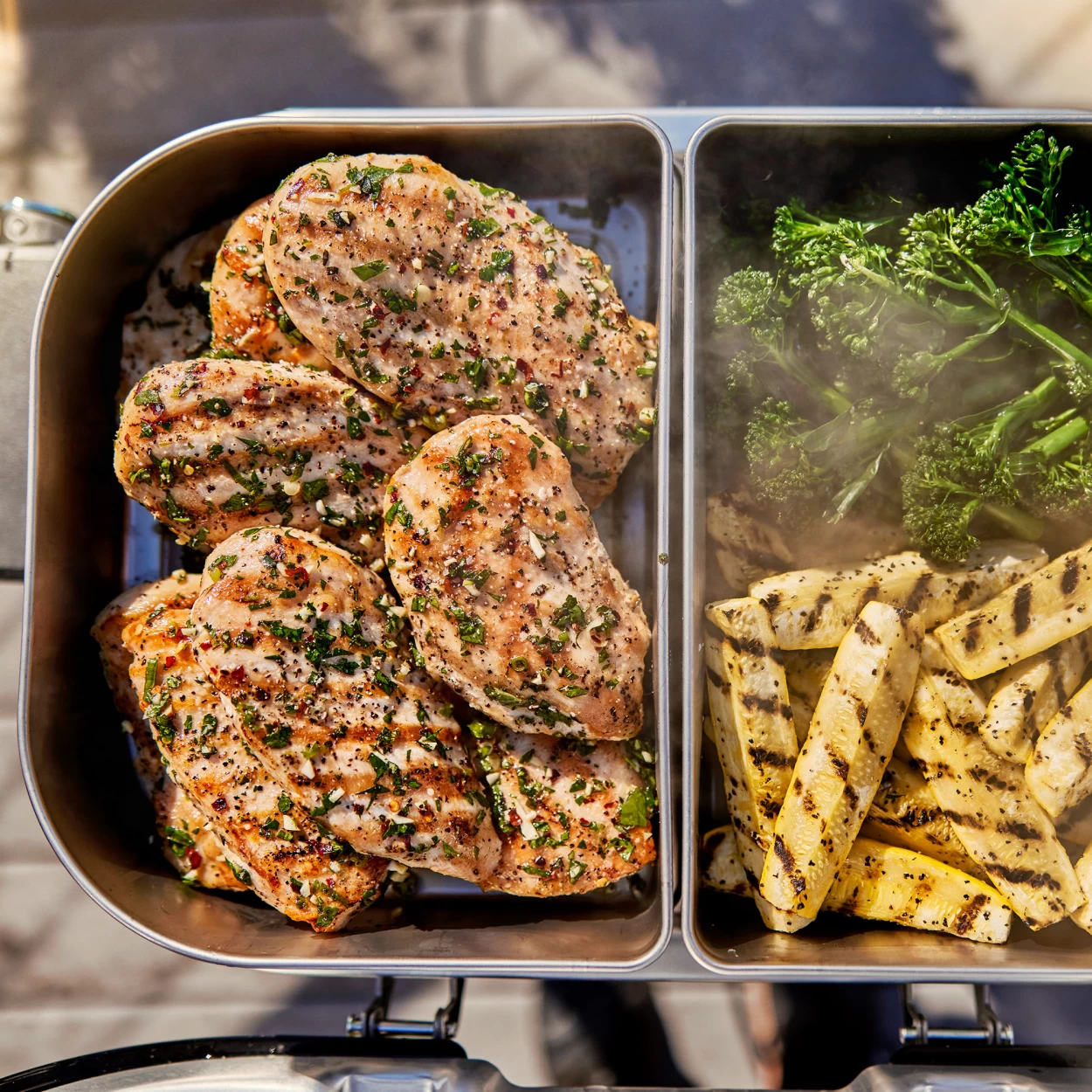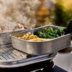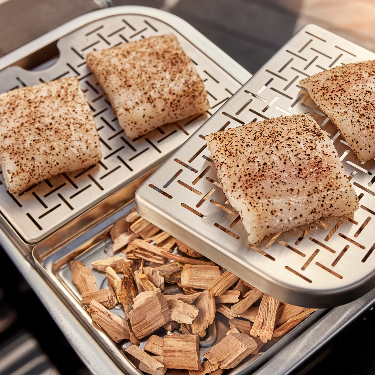 Optimieren sie die Möglichkeiten ihres Lumin* Compact Elektrogrills mit diesem 4-teiligen Multifunktions-Set. Der Mehrzweck-Behälter erweitert die Dünst- und Räucherfunktion ihres Grills über die gesamte Grillfläche. Er verwandelt die Rauchzufuhrfunktion ihres Lumin Grills in einen vollständigen elektrischen Smoker. Geben sie einfach ihre Lieblings-Räucherchips von Weber hinzu, um Rippchen, Schweineschulter und Rinderbrust bei niedriger Hitze langsam zu garen. Außerdem können sie damit frisches Gemüse, ganze Fische oder Hummer dünsten. Und wenn es Zeit zum Essen ist, können sie ihren Gästen mit den beiden Warmhalteschalen des Sets ein echtes Büffet-Erlebnis bieten, bei dem die köstlichen Gerichte über Stunden auf der richtigen Temperatur gehalten werden – ganz ohne Anbrennen oder Austrocknen.