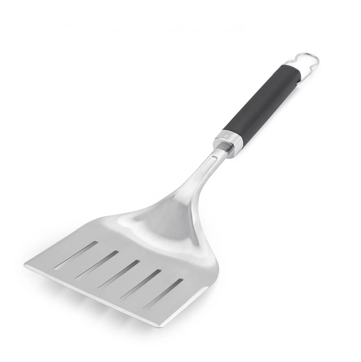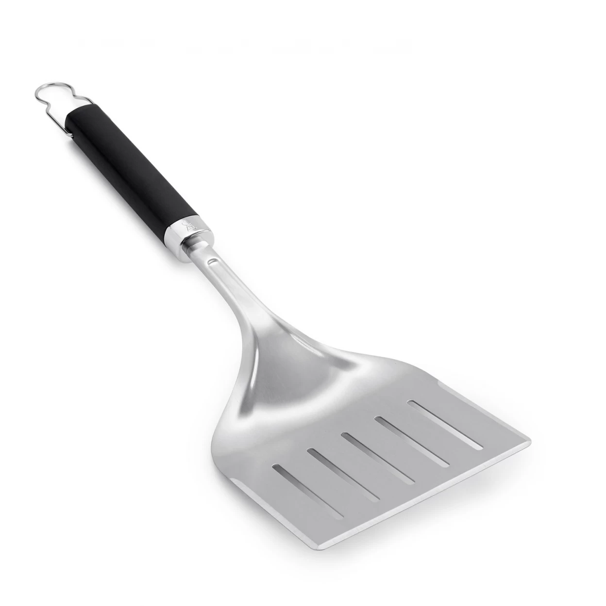 Aus Edelstahl mit schwarzen Anti-Rutsch-Griffen. Metallschlaufe zum Aufhängen. 3-seitig abgeschrägte Kante gleitet aus jedem Winkel unter das Grillgut. Spülmaschinenfest.