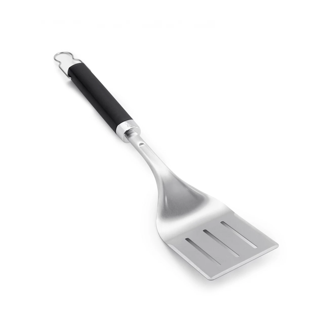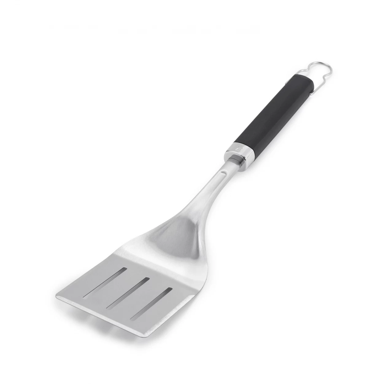 Aus Edelstahl mit schwarzen Anti-Rutsch-Griffen. Metallschlaufe zum AufhĂ€ngen. 3-seitig abgeschrĂ€gte Kante gleitet aus jedem Winkel unter das Grillgut. SpuÌlmaschinenfest.