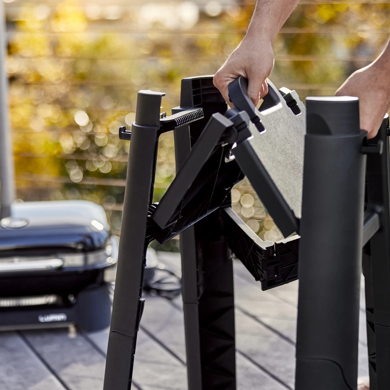 Mit dem Stand mit Seitentisch wird das Grillen auf ihrem Lumin* Compact Elektrogrill noch bequemer. Durch das zusammenklappbare Design lĂ€sst er sich einfach aufstellen, zusammenklappen und in einem Schrank oder in der Garage aufbewahren. Auf dem Seitentisch bekommen sie zusĂ€tzlichen Platz zum Zubereiten und Servieren und dank der integrierten Haken ist ihr Grillwerkzeug immer griffbereit. Dieser Stand mit Seitentisch ist besonders fuÌr das Grillen auf dem Balkon oder auf der Terrasse unverzichtbar.Â