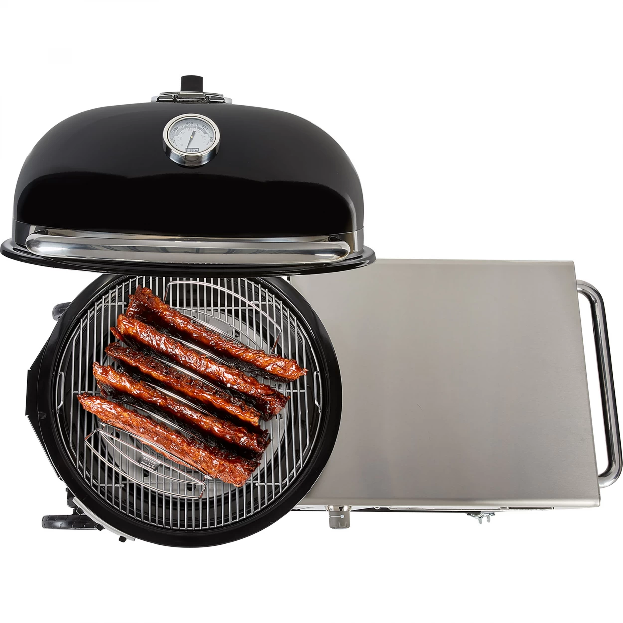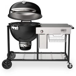 Der sehr belastbare Stahlrahmen ist speziell dafĂŒr entwickelt worden, dass er den schweren und massiven Kessel tragen kann und dabei die nötige StabilitĂ€t hat. Die RĂ€der an den Beinen sorgen dafĂŒr, dass der Grill bequem bewegt werden kann, auch gerne mal ĂŒber Schotter oder grobes Pflaster. Der Boden des Grills besteht aus Stahlstreben und einer Platte und dient als Ablage. Der massive und besonders robuste Seitentisch aus Edelstahl sorgt fĂŒr noch mehr StabilitĂ€t und bietet ausreichend Platz fĂŒr die Zubereitung der Grillgerichte.